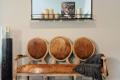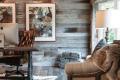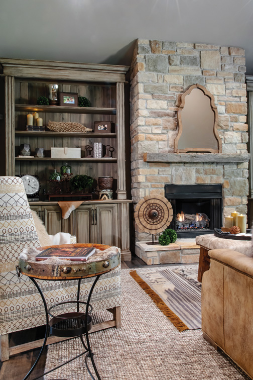 Reinforcing the rustic décor, a barnwood mantel was installed on the hearth room’s original fieldstone fireplace, then flanked with beautiful bookcases designed by Heidi, artistically finished by Nettie, and custom-crafted onsite in the boathouse garage. Comfortable and casual, the hearth room furnishings include a soft leather, camel-colored sofa, cushy armchair, hair-on-hide ottoman, cigar barrel accent table, and furry alpaca throws, all arranged on layered woven Tibetan and Berber-style wool rugs.