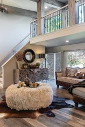 The focal point of the great room seating area is a fluffy alpaca ottoman that is five feet in diameter. The ample sectional combines nailhead studded, crocodile-textured leather, tweed with leather piping, and suede accent pillows in hide and printed tapestry. Overhead, the railed loft provides a tranquil sitting area with panoramic lake views and leads to the three upstairs bedroom suites.