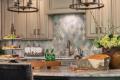 Other highlights of this beautifully designed culinary center include a concrete-colored undermount sink with an exquisite stone tile backsplash and champagne bronze fixtures; two Fisher & Paykel dishwashers; and a Jenn-Air double oven and microwave. Against an adjacent wall, the homeowner's existing desk was transformed into a fabulous wine and coffee bar with a honed granite top, mirrored backsplash, icemaker, beverage cooler and overhead cabinetry.