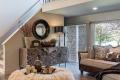 Original to the home, a 3-by-5-foot aquarium in one wall of the great room was retained, becoming essentially a kinetic art piece. Similarly intriguing, a unique Louis XVI-styled bench covered in hair-on-hide is positioned against another wall and topped by an antique pharmacy mirror.