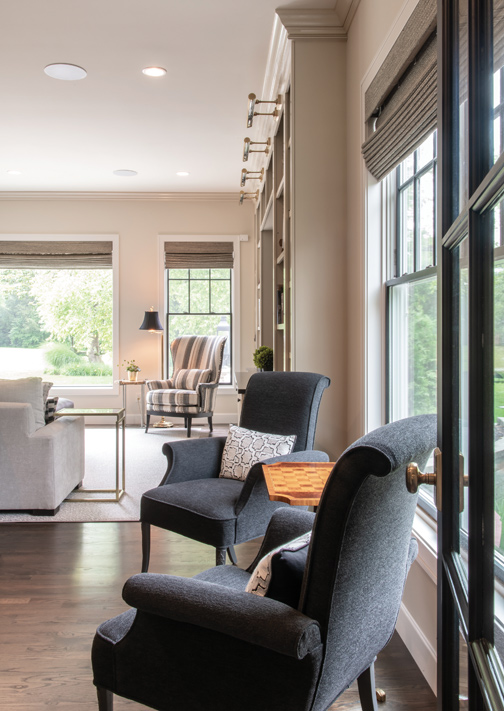 Salinas recommended classic East Coast styling — open, warm, casual and easy to maintain, with “pops of European.” Capitalizing on the 10-foot ceilings, transoms were added to various windows and doors, and the existing caramel oak floors were extended and feathered into the new spaces then refinished in an “espresso bean” tone. For an authentic coastal feel, the window casings and muntins were painted black and the drapes replaced with organic Overland woven shades.