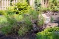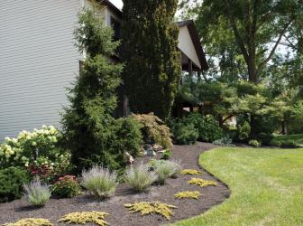 One of the things that Mike likes to point out is that even though they are commonly called evergreens, conifers come in a variety of colors that provide year-round garden interest. For instance, the scale-like foliage of low growing "Motherload" junipers, ringing the front of his home, shines golden yellow in the spring and summer but turns pinkish purple during winter.