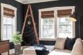 Open to the kitchen, the newly added family room also deviates slightly from the neutral décor with blue-gray “Hale Navy” walls enhancing the coziness of the space. A cleverly designed ladder “tree” is strung with tiny lights and a starburst, and at its base, a galvanized container holds a live Norfolk pine.