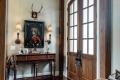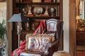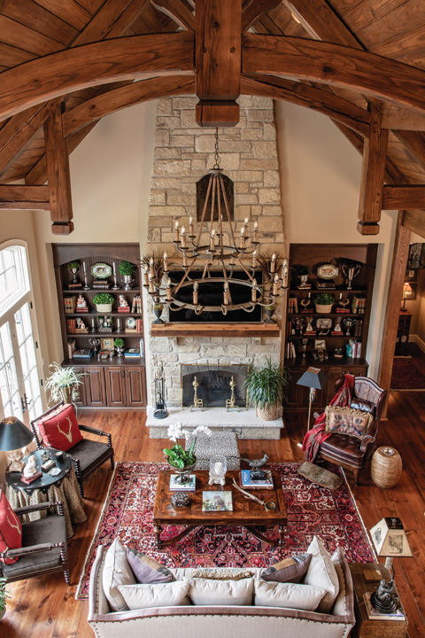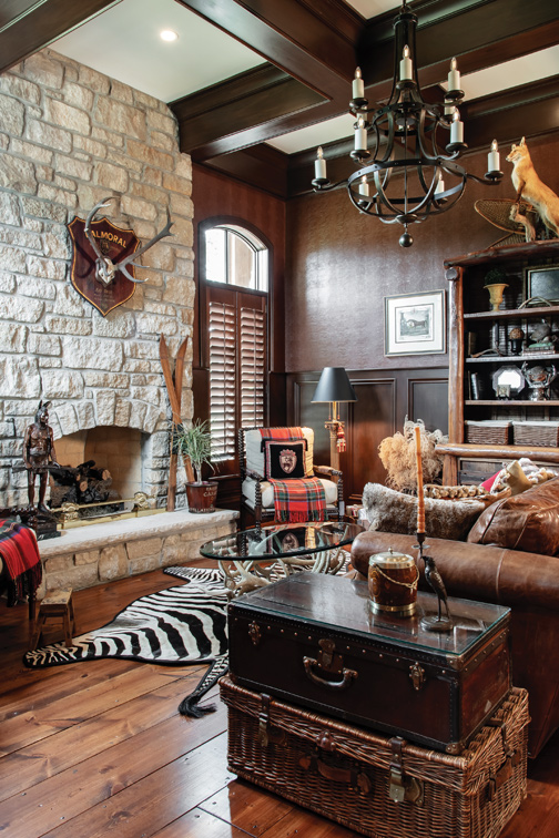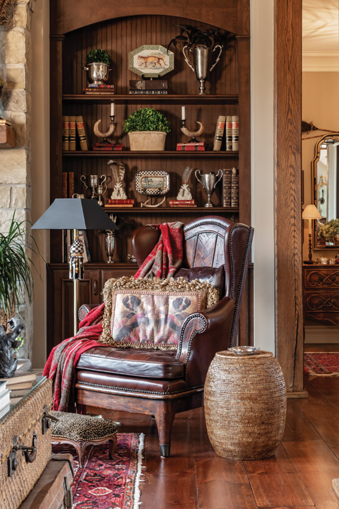“We are really drawn to natural elements like feathers, antlers and baskets,” says the homeowner. “I have always loved vignettes created by the late Charles Faudree, and I believe decorating is all in the details—a tassel on a doorknob, a feather or two in a silver loving cup, a Roebuck antler on a Black Forest plaque above a door over a picture. I also love using things found in antiques or consignment stores in new and unexpected ways. In our great room, I had our mason place an old iron fireback into the stone above our fireplace. We never even cleaned it up—I love the well-worn patina that resulted from many fires and it’s one of my favorite things in the house,” she adds.