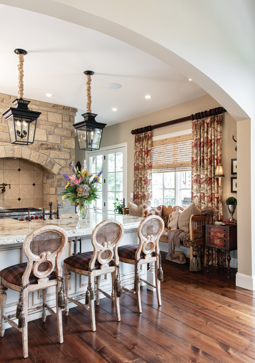 “Our house sits on five and a half acres, so it always feels like you are in the country,” says the homeowner. “We are surrounded by horse people, and there are many bridle trails that our neighbors keep trimmed back for the enjoyment of all of us. It’s not at all uncommon to look out a window and see people on horseback with three or four dogs or a neighbor driving a team of mules,” she laughs. “Ultimately, we wanted to have a home where we could enjoy the outdoor space as much as our interior spaces. My husband and I both love French Country style but we don’t adhere to any specific design rules—if we love it, we make it work in the design,” she notes.