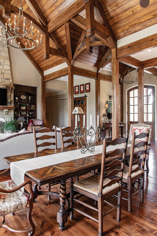 When planning began with Darryl Labruyere, owner and lead architectural designer at DL Design. the couple knew they wanted a one-and-a-half story house with French Country architecture. From there, they determined the specific rooms that were necessary in their new dwelling. The first floor included a master suite with a sitting room, a study, a great room with a vaulted ceiling made of rustic timber beams and a spacious kitchen opening onto a large dining area.