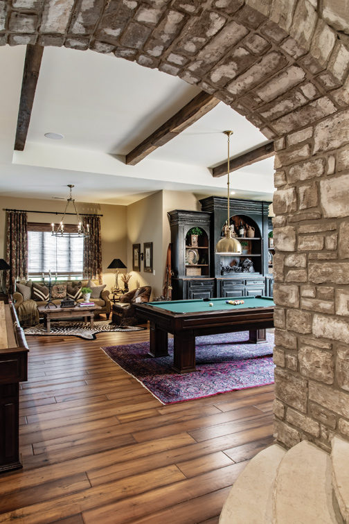 “The homeowners entertain many friends and neighbors in the Huntleigh hillsides, so their great room was designed to be the grand feature opening to the kitchen through a large, sweeping archway,” says Darryl. “The combined space of the kitchen and great room afforded room for a harvest-size dining table and a large seating arrangement facing a magnificent stone fireplace,” he adds.