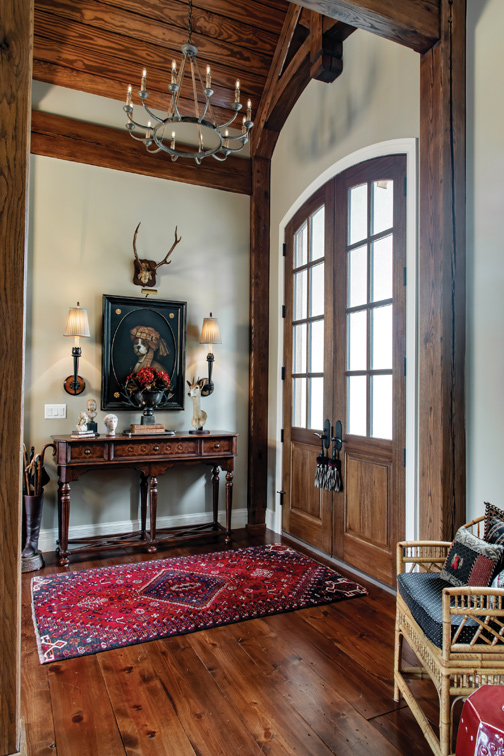 To complement their impeccable style, the couple decided that an authentic timber-framed porch would be the perfect entry detail. Inspiring the overall design, the eye-catching timber embellishments carry through to the foyer, the great room and finally to the roof under the covered area of the stone-tiled deck at the back of the house. Aesthetically, the fine craftsmanship of the joinery and the wooden fasteners in lieu of nails were all worth the extra effort and costs.