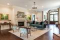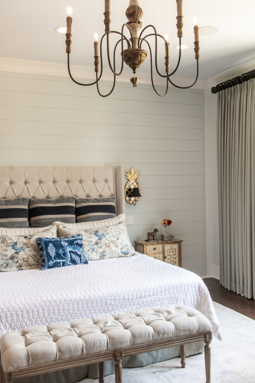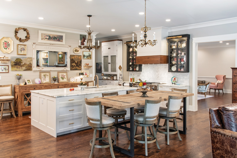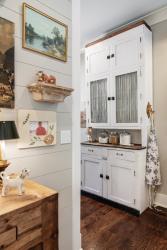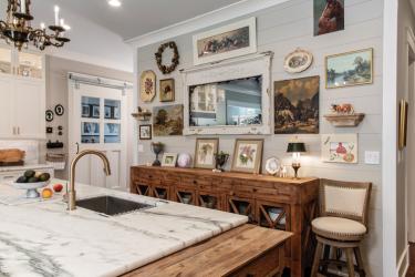 The heart of the home, though, is unquestionably the expansive family room/kitchen/breakfast room/casual dining area and adjacent conversation/sun nook. Fifteen-foot accordion doors access the screened porch from the family room, and a 10-foot marble-topped island defines the kitchen. Epitomizing the blend of modern farmhouse and French country styling, the kitchen has shiplap walls arrayed with artwork, a wood-aproned range hood, and black wall cabinets, customized with museum lights, black glass font cabinets lined with black and floral wallpaper, and displaying heirloom china pieces.