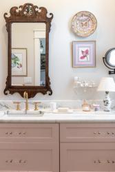 Off the foyer, the living room showcases a cast-stone fireplace (the firebox outlined in black), vintage French provincial accent chairs and a unique bi-level coffee table in glass, marble and brass from The White Rabbit that displays a collection of antique napkin rings and baby teething rattles. Like most of the home’s antique rugs, the woven wool oriental had also come from Susan’s dad.