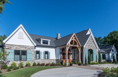 Various materials salvaged from the original property were also repurposed. For example, reclaimed timber beams were used for the new screened porch, and the former barn door was installed on the lower level. Susan participated in virtually every exterior/interior selection and personally designed the blend of the front masonry, choosing tumbled stone in cedar and gray hues with a rubble finish. “Her involvement made the process seamless and more fun,” Day remarks.