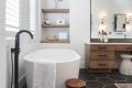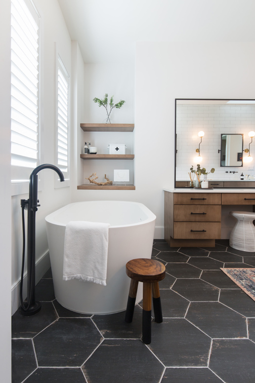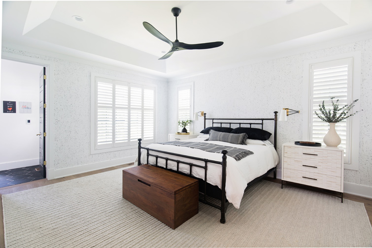 In the main-floor master suite, a deep tray ceiling adds dimension to the bedroom, and the simple, predominately white décor achieves a remarkable sense of serenity. The wallpaper simulates white birch, contemporary West Elm side chests flank the wrought-iron bedstead from KDR, and a wood blanket chest at the foot adds a touch of warm color. Even the master bath conforms to the modern farmhouse look. Filled with natural light by windows and skylights, this spa-like retreat includes a freestanding, matte-finished soaking tub, spacious tunnel shower, smoky brown cabinetry, display shelving, bold hexagonal floor tiles and wrought-iron accents.