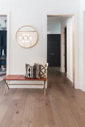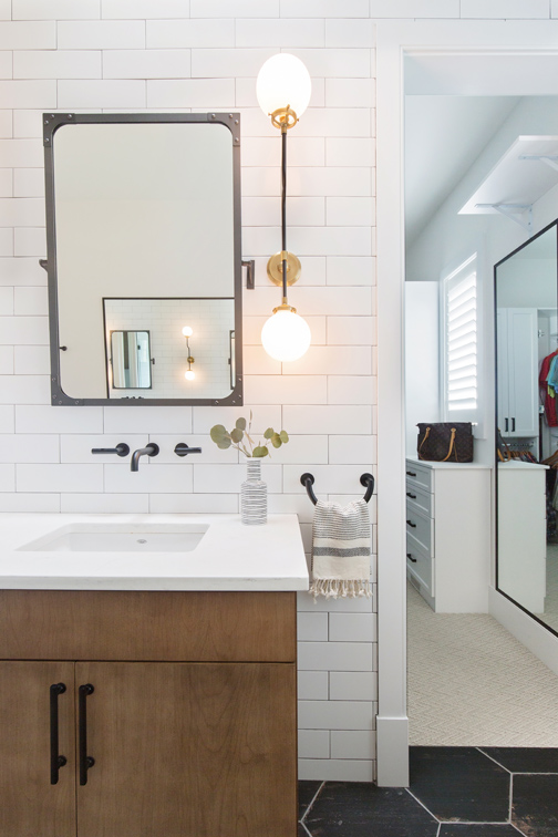 Since classic farmhouse décor emphasizes a basically neutral color scheme, natural materials, and uncluttered design, subtle themes were used to link the individual spaces. For example, all interior doors and the window grilles are black. Metal accents on the main level are mixed, but all metal finishes on the lower level are chrome. While woven wood shades lend a natural feel to the activity areas, plantation shutters provide additional privacy in the bedrooms, and the cased openings to several areas are framed with oak floor planks.