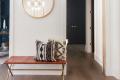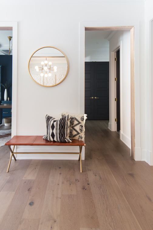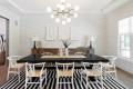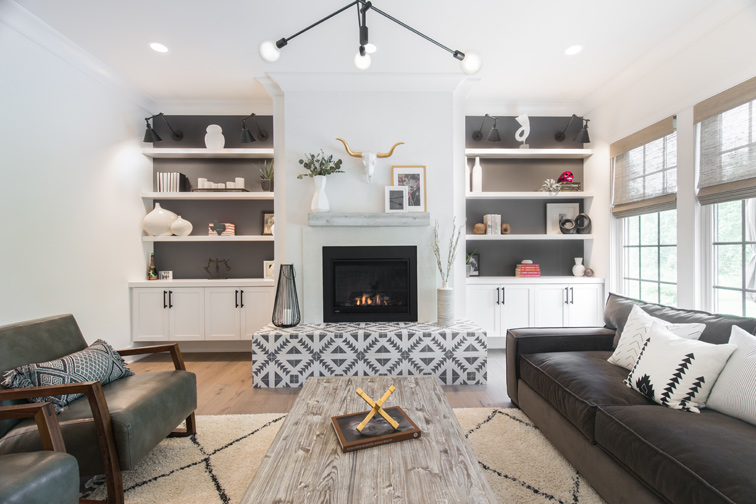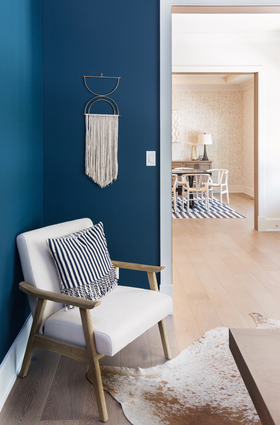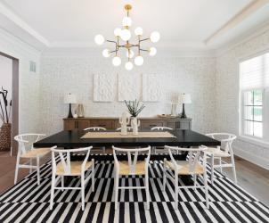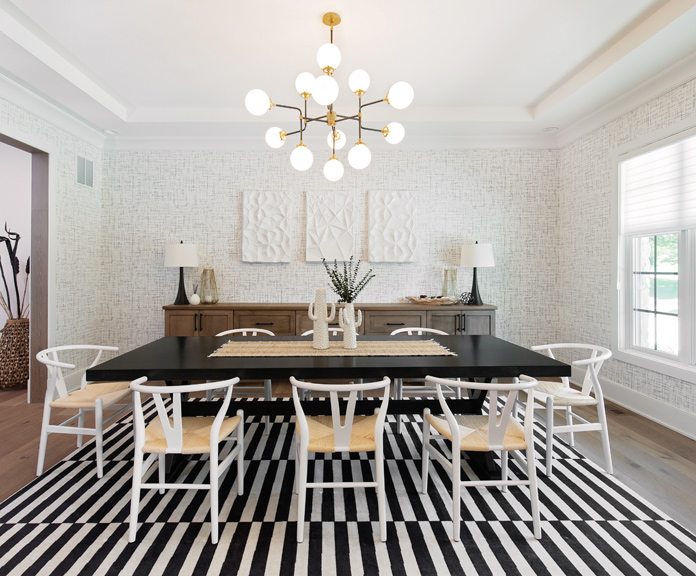 Off the foyer, the dining room immediately establishes the home’s unique ambiance. A tray ceiling, Phillip Jeffries wallpaper and a striking black-and-white area rug create visual interest, and against the main wall, a built-in sideboard repeats the flooring’s wood tones. The table base and natural jute chair seats also introduce a recurring “X” motif that Esther used throughout the home. “Lighting is really important to me,” she added, indicating the contemporary chandelier and noting that the light fixtures vary from room to room, enhancing the individuality of each space.