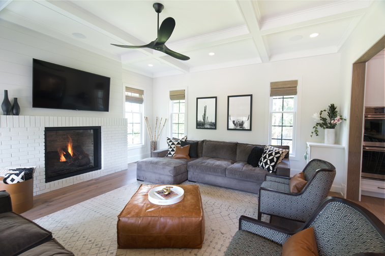 Cozy yet classic, the adjacent hearth room is perfect for TV viewing and gives a nod to farmhouse décor with its white brick fireplace surround and shiplap walls. Velvety sectionals and streamlined accent chairs from Arhaus are arranged around a large leather ottoman, and patterned throw pillows and artwork provide Southwestern accents.