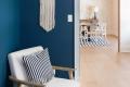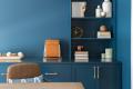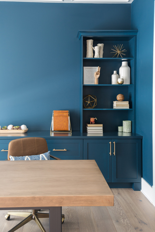 Opposite the dining room, Doug’s office is a sophisticated blend of rustic and contemporary styling with its beamed ceiling, rich Hague Blue walls and cabinetry and brass hardware.