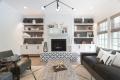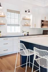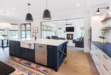 Clearly the hub of family activity, the open kitchen, casual dining area and hearth room showcase the Cohens’ combined expertise. Surfaced in black suede granite, the kitchen’s white perimeter cabinetry incorporates high-end stainless appliances and revolves around a 12-foot island with Hague Blue base. White quartz tops the island, which includes a dishwasher, farmhouse sink and handy dustpan vacuum base.