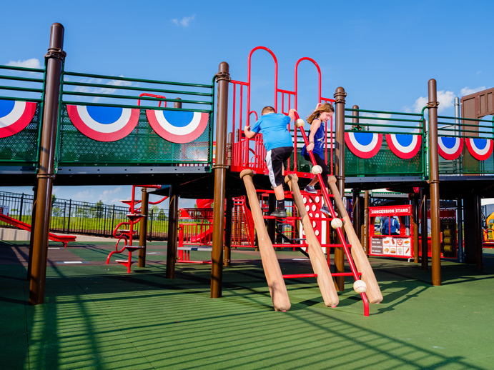 Jake’s Field of Dreams Playground, Wentzville, MO. Photography courtesy of Unlimited Play | Opened in 2018, Jake’s Field of Dreams Playground is an inclusive playground located within Heartland Park in Wentzville. An inclusive playground is intended to include every child, with or without disabilities or critical illnesses. They are meticulously designed to provide a safe area where children of all abilities can play together while removing physical and social barriers. Inclusive playgrounds integrate all senses and encourage social play. Jake’s Field of Dreams is an inclusive playground dedicated to Jake Vollmer, a spirited sports-lover with Duchenne Muscular Dystrophy. From a young age, Jake was passionate about sports and wanted to grow up to be a professional. However, his diagnosis made it impossible for him to play like his heroes, but it didn’t keep him from loving the game! Though Jake passed away in 2012 at age 19, his spirit and love of sports live on. Jake’s Field of Dreams was built by Unlimited Play, a non-profit organization that helps to plan, design and build fully accessible playgrounds. Unlimited Play playgrounds allow all children, regardless of their abilities, to play together.