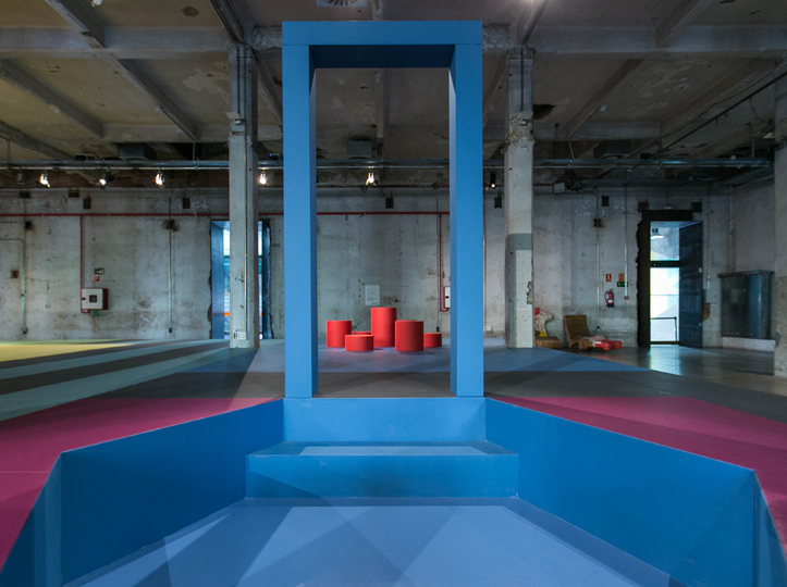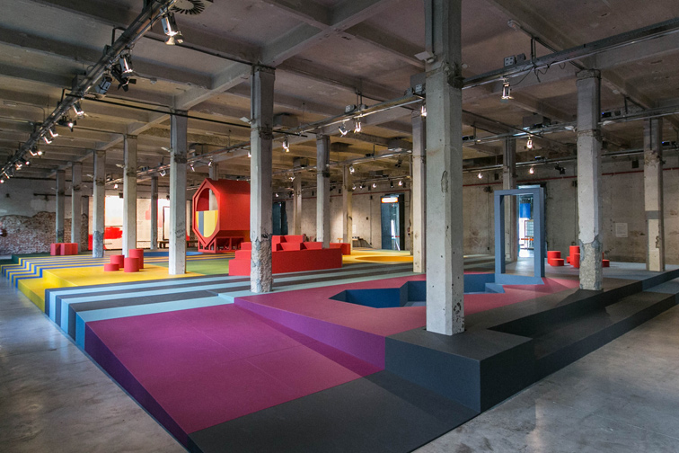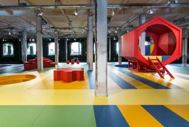 Landscape for Play, Madrid, Spain. Photography courtesy of Aberrant Architecture | When thinking about an area to build a playground, a former slaughterhouse is not the first place that might come to mind. However, Aberrant Architecture took on the task of transforming the old slaughterhouse space into a colorful and vibrant playground based on the work of Dutch architect Aldo van Eyck, who primarily worked in Amerstadam after the second world war. Van Eyck was known for using geometric shapes to create a terrain that would best stimulate imagination, human interaction and play. The large shapes that make up the terrain are painted in bright colors such as red, yellow, green blue and black, all of which are references to postwar graphic design also commonly seen in van Eyck’s work. While the colors are also a nod to the architect’s work, their vibrancy allow for a stark contrast with the industrial architecture of the old slaughterhouse building. The building itself is now called the Intermediae exhibition space, and Landscape for Play is only the second playground to be incorporated in the building. Having projects like these playgrounds give a new role to children in cultural institutions.