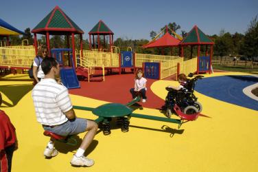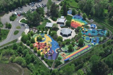 Clemyjontri Park, McLean, VA. Photos courtesy of Fairfax County Park Authority | The Clemyjontri Park in McLean, Virginia, gives children of all abilities the chance to play and experience a wide range of adventurous equipment. One of the most striking components of this playground is its Rainbow Room. The bright color scheme supports imagination and also helps younger children learn the colors of the rainbow, while the wide variety of colors gives the playground its striking appearance to passersby. This 2-acre playground features four outdoor areas that surround its centerpiece, the carousel. The Schoolhouse & Maze area promotes educational games that help children learn about the world, geography and time zones. The Moovin’ and Groovin’ Transportation Area has a race track, and it is designed with motorcycles, planes and trains with all young car lovers in mind. For kids with a love for sports and fitness, the Fitness & Fun Room provides a large jungle gym to promote children’s physical strength, (not to mention that it’s sure to tire them out!) In 2010, the park raised enough funds to install the first Liberty Swing in Virginia. The Liberty Swing allows children in wheelchairs to swing without being transferred from their wheelchair to the swing itself. Clemyjontri Park is an enthusiastic, eye-catching park that has something for everyone.