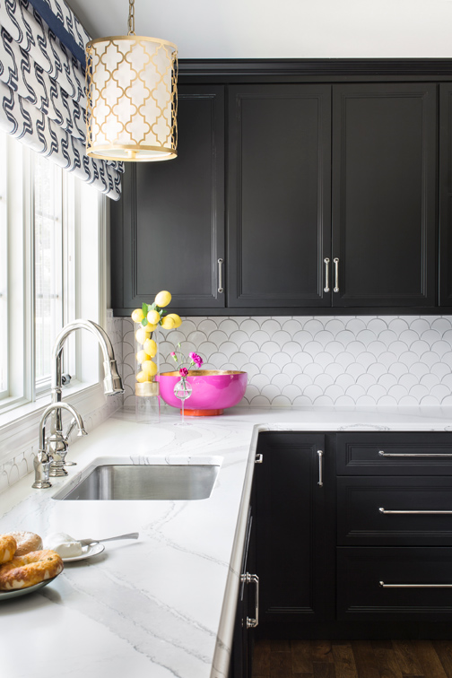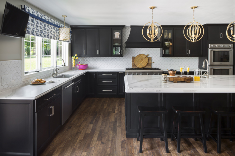 After selecting black cabinets for her new kitchen, the wife says she “had absolutely nothing else pinned” or any other ideas when she went to Carol Temple and Krissy Dickey of Pizazz 2 Interiors for design help. “I just wanted the house to be cheery and happy,” the wife says. Temple and Dickey had already advised the homeowner on a small-scale design project when the family purchased the home in 2015. “I told Carol then, if you can work with me to incorporate what we already had with the house’s dark woodwork, I promise you down the road we will either move or we will remodel this house, and it will be a fun project,” says the wife.