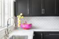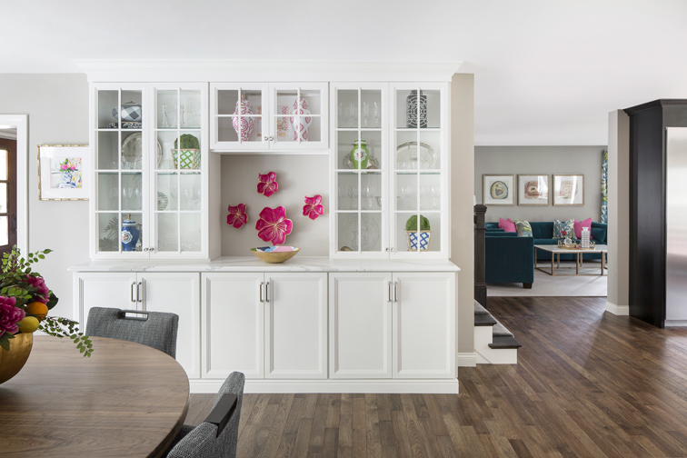 Temple notes the homeowner is “a huge Dana Gibson fan.” A luxury home furnishing designer, Gibson’s use of bright colors and bold, hand-painted patterns exemplify the cheerful, light-hearted aesthetic the homeowner favors. Indeed, the homeowner describes the design style she wanted as “sophisticated casual.” In the redesigned kitchen, pink, green and blue accessories pop in a white cabinet. The wife notes “the remodeled kitchen is now an awesome living space where we all hang out and thus spend more time together.”