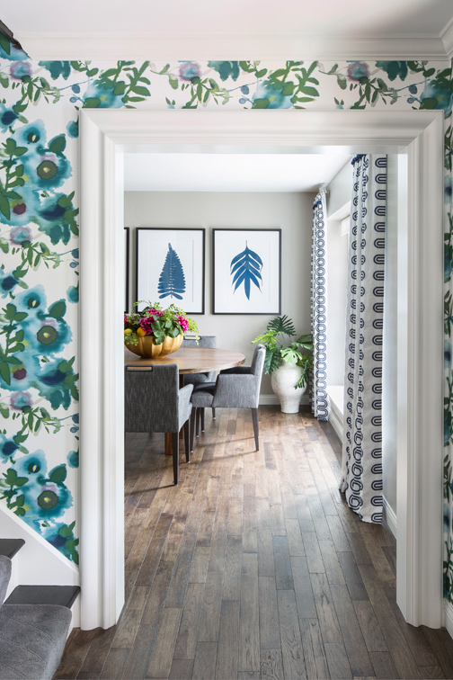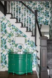 And fun they had. The wife loves color, according to Temple. “When they decided to blow out the back of the house and stay there, that’s when we went full throttle,” Temple says. An early decision was a Thibaut wallpaper in a green and blue palette for the entryway. Seeing it in the sample book for the first time, “it looked like a watercolor painting,” says the wife. “I loved it. You only live once, so, I thought let’s go bold and bright.”