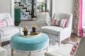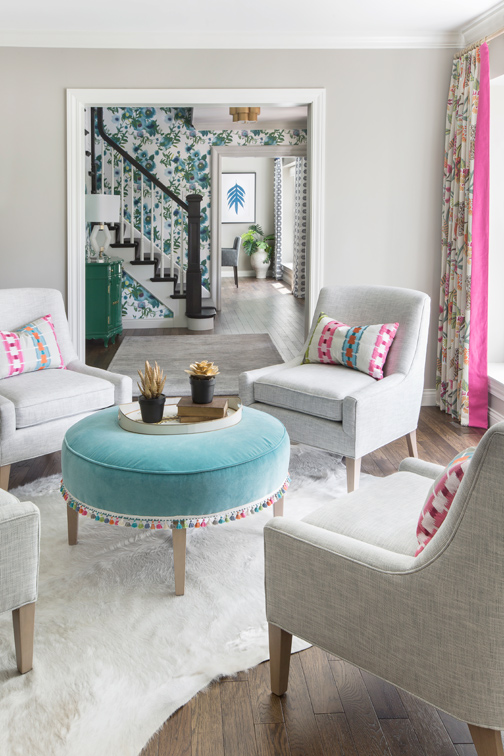 In a sitting room adjacent to the entry, Temple and Dickey suggested a grouping of four, light gray armless chairs around a delightful C.R. Laine velvet ottoman in aqua accented with orange, green and pink tassels. “Using the armless chairs rather than doing a traditional sofa made it more like an entertaining area,” says Temple, who maintains her design studio inside Rusted Chandelier in Kirkwood. “Armless chairs are easier to get in and out of, and they look pretty.”