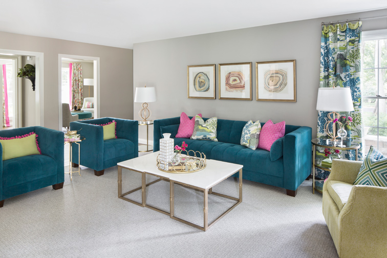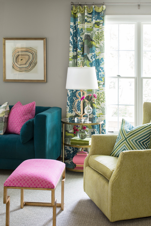 The homeowners entertain family and friends frequently; an important goal for the renovation and design choices was to encourage guests to feel at home. “To me, the chosen color palette of greens and blues with splashes of pink throughout makes everyone want to stay and be happy here,” says the wife.