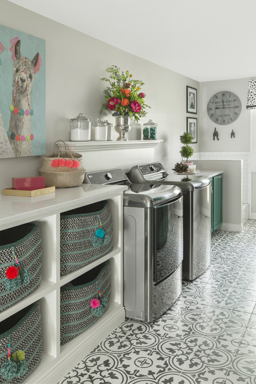 Organization needn’t be boring, however. “Because the laundry room is where I spend a lot of time, I also wanted it to be fun and uplifting,” she says. Cabinets in the “mom’s hub” area of the laundry room, where the wife has her home office, are a beachy aqua. The colorways for the baskets were taken from a charming 50-inch-by-36-inch wall canvas of three llamas wearing tassels and orange, pink and aqua pompoms; Debbie Bruns of Pizazz 2 Interiors crafted coordinating pom poms for each basket. “The attention to detail and final touches the girls at Pizazz 2 put into their work with their clients makes it a joy to work with them,” says the homeowner.