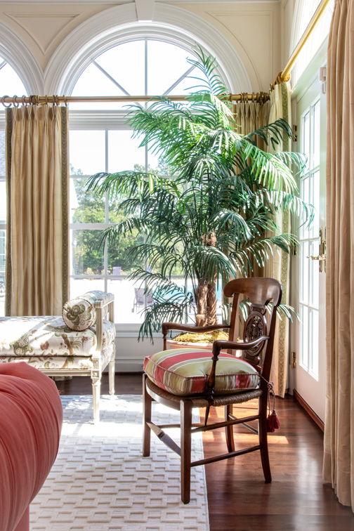 “It was clear that this was a space for guests, and it was discussed as an entertaining space rather than a family space. We decorated it with an eternal cocktail party in mind,” explains Teddy. When he came onto the design team, he helped her pick the color of this custom sofa, and its salmon hue definitely makes a statement in the more traditional-style setting, especially when it’s hit by the light that streams off the pool deck and in through the windows. The homeowner added hand-me-down trinkets and decor from her mother to the beautiful existing clam-shell-patterned built-ins to combine the traditional look in the living room with her own fresh, funny style.