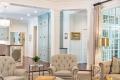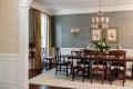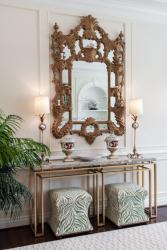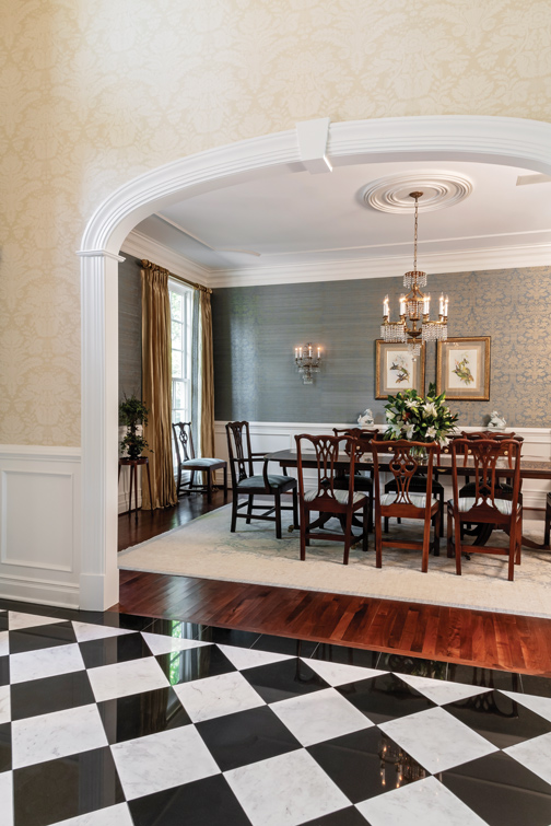 When it came to her dining room, the homeowner knew she wanted a richer, warmer color palette to enhance the dim candlelight she envisioned using at dinners. Teddy and the homeowner chose a blue silk wallpaper with gold accents that matched the seat covers and didn’t overwhelm the dark furniture. “We used the wallpaper as a starting point for the design of this room,” says Teddy. “She wanted the room to feel special, and that wallpaper made it.”