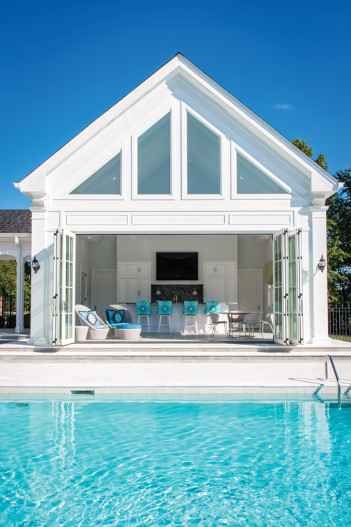 After two years of waiting for the remodel to wrap up, the young family moved into their new home. However, their work wasn’t finished. They still wanted to revamp the old pool house. The building had environmental problems, so they gutted it to allow for an open-concept with a bright and fun design. Bumping the pool house out toward the pool added the extra space they wanted, and the retractable doors make for an easy flow from place to place.