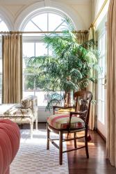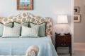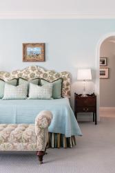 A similar fabric story takes place in the master bedroom. Once Teddy showed the homeowner an option for the drapes, the rest of the room’s design fell into place. The drapes and the headboard are made with printed silk with light blue and green tones, and the satin-stripe dust ruffle plays with the light in the room.