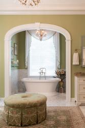 Beautiful plumbing fixtures bought through Immerse stand out next to the green ottoman from her living room. The crystal chandelier lights the bathroom with a sense of style, while glass beads from the sheer fabric drapes catch natural light. When they feel like they want more privacy in their master bath, they can draw their Hunter Douglas Silhouette shades with a privacy liner down to block out unwanted eyes.