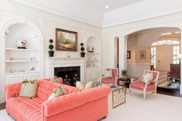 She and the previous designer had a disagreement about the centerpiece for her living room. The centerpiece is a double-sided salmon pink sofa that the homeowner had dreamed of having since she’d seen the original design in a catalogue years before. The double-sided couch allows for two distinct seating areas in the same room that creates a flow of conversations and guests.