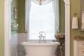 “I designed the tile pattern that goes around the bathroom floor and up the wall behind the bathtub,” the homeowner explains. When she originally picked out colors for the tile, she thought she’d be getting the accent of a very rich army green. However, when the tile was delivered, she panicked to see that the color was actually much closer to gray. That influenced their decision to incorporate warm green paint on the walls and the same color in the window treatments.