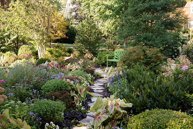 One of the plants she depends upon most heavily to provide rhythm and flow to her garden are caladiums, which she orders by the box from Florida grower Caladium World. The giant, heart-shaped leaves in green and white, tinged with rose highlight her garden and provide a cohesiveness that ties together different areas, as the foliage plants thrive in both partial sun and shade.