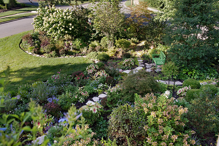 Originally from Missouri, Brenda had lived in Michigan and Wisconsin before moving back to this area. Gardening here, with the extremes of temperature, was a “big transition,” she says. “This lot was so open. I spent hours pouring over catalogues and books. I learned a lot more about varieties of plants” for the St. Louis climate.