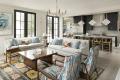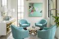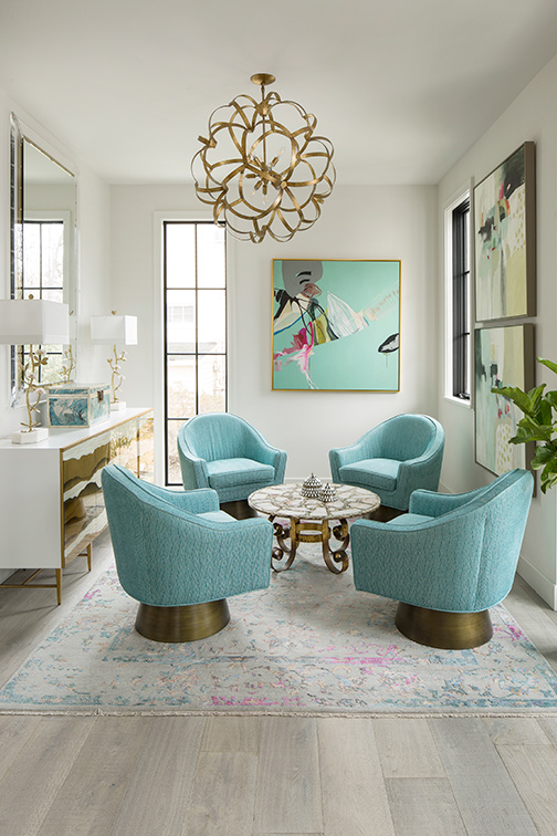 Yet, this is a family home throughout, as two little girls have now joined the family since planning began for the new home. Considering how life changes when children enter the picture, a front room of the home was originally envisioned as a playroom. Jewell suggested utilizing the space as a sitting room that would meet everyone’s needs, not just the youngest family members. The designer envisioned the parents reading to the girls or the children coloring on a round coffee table in the space, which is now as stylish as any “Mad Men” set. Turquoise chenille swivel chairs give off a Mid-century vibe, particularly when paired with an adjacent lacquer-topped cabinet housing the girls’ toys and games. “I like spaces where kids can still go in them but if adults come over in the evening, they can sit and have a glass of wine and converse with each other,” says Jewell, herself a mother of four.