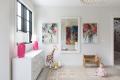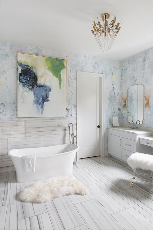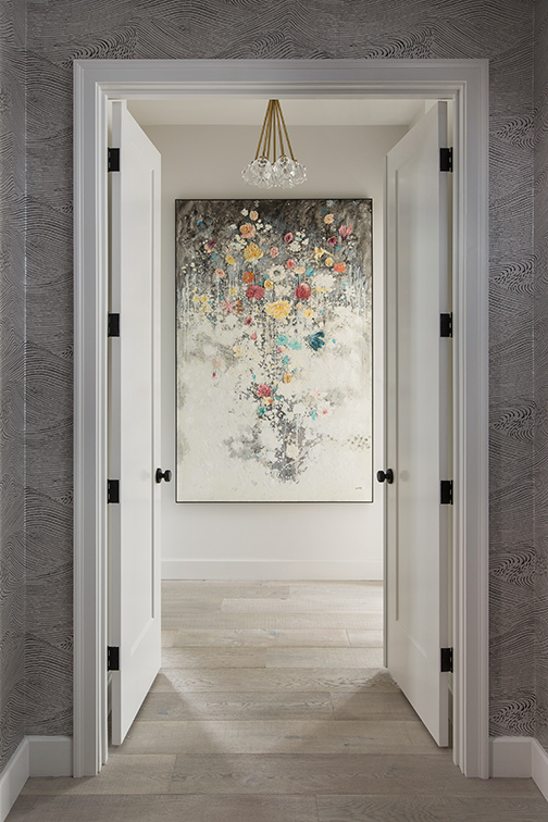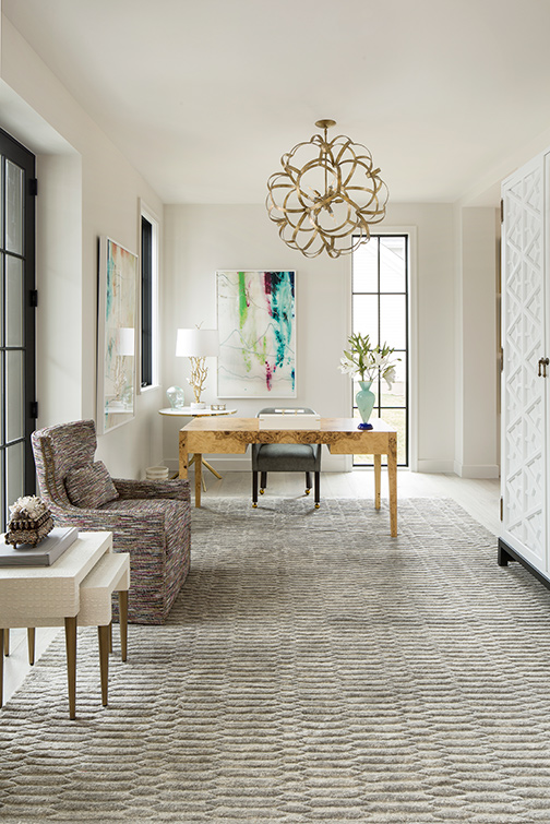 Indeed, artwork takes center stage in the home. With white walls and clean lines, “it’s almost like an art gallery feeling,” says Jewell. She helped the couple pick artwork in a mix of mediums—oils, watercolors, prints—that evoke a sense of movement and playfulness.