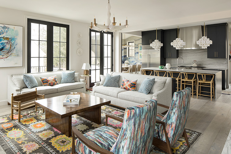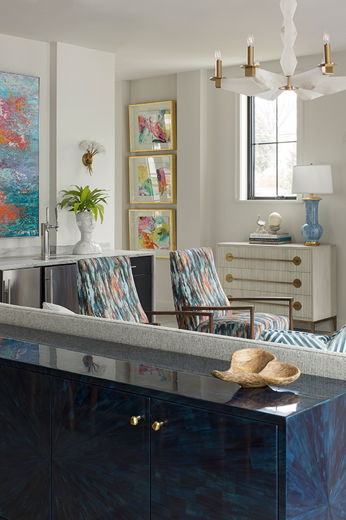 Setting the tone for fun, the family room’s reclining chairs covered in a Romo fabric helped establish the colorways used throughout the home. “It’s a cut velvet with blues, pinks, black, aqua and a little orange,” says Jewell. Neutral sofas pair with a burl wood coffee table.
