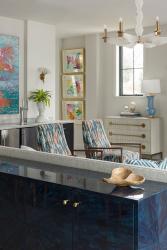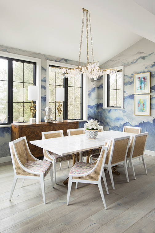 “The house is very open,” notes Jewell. “You don’t want everything to be matchy-matchy, but it all has to go together.” The light fixtures are a great example, she says. In the family room, a John-Richard white alabaster chandelier with gold tones coordinates beautifully with dynamic Jonathan Adler pendants in the adjacent kitchen. “They’re different, but they have the same sort of feeling,” Jewell says.