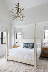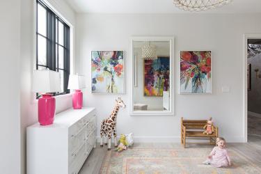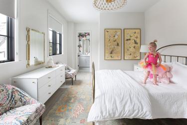A sense of sophistication continues in the children’s bedrooms. “She didn’t want bunny rabbits and balloons,” Jewell says of the homeowner. Thinking long-term, the young mother wanted beds and dressers that could grow with the children and could also work in another home if the family ever moved, says Jewell. Case in point: the artwork in the older daughter’s bedroom. A silk screen of butterflies with gold leaf detail “is kind of playful but yet will still look great and work as she gets older,” says Jewell. The designer also utilized Mid-century Modern chairs the homeowners already owned by reupholstering them in a Schumacher cotton blend. “We even had the fabric treated so if the kids spill something on them, it will still wear like iron,” says Jewell.