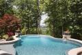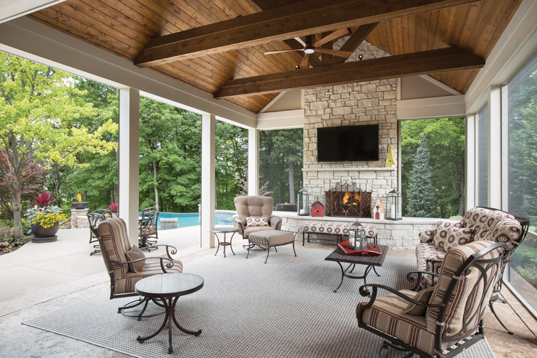 When completed, two elements dominated the outdoor space. A mammoth, 1,200-square-foot, screened porch encompassing a sitting area with a rustic stone fireplace and large-screened television, a dining space and a stunning outdoor kitchen truly brings the home’s living space outdoors. Adjacent to that, a large, infinity-style pool by Baker Pool & Spa, that seems to flow directly into the nearby oak and hickory forest, creates a watery woodland oasis.