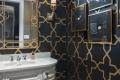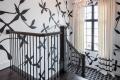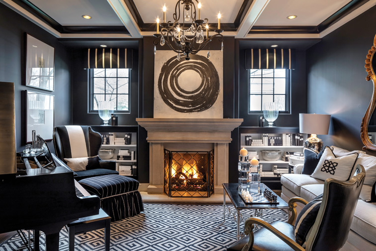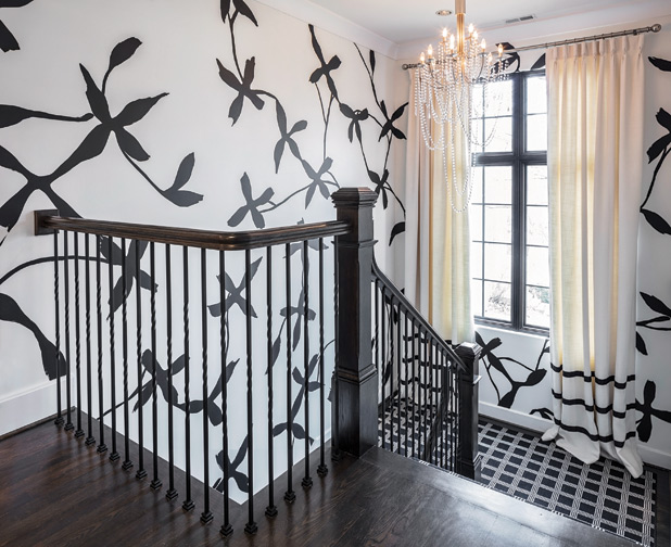 In several rooms, the glam is brought via walls hand-painted by Tribout’s full-time artist. In the round front entry, for example, the artist painted a thin black stripe accented with a diamond shape. “Everything in this house that looks like wallpaper is hand-painted,” says Joy. The designers asked their artist to interpret a carpet’s geometric shape for the first-floor powder room’s black and gold walls. “You never know where we might see a design pattern,” says Tammy. “It might be a jacket or a rug.” Or it might be piece of jewelry or a dress that inspires the team to utilize the design on a wall or in a pillow, Joy adds.