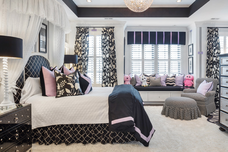 The young daughter proved to be most discriminating member of the family in making final decisions for the design in her bedroom, according to Joy. “She was definitely opinionated about what she wanted, much more than her mother, actually,” Joy laughs. “It was really cute.” To add the lavender color the daughter desired, the Tribout team brought touches of the hue to the bedroom with great attention to detail. For example, their artist painted small lavender bows strategically placed atop thin stripes of black paint. A black cornice above the window seat is trimmed in stripes of varying shades of purple. Lavender pillows—both solid and in the Tribout-signature “X” shape – are piled on the bed and the window seat.