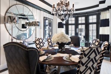 Upping the glam even more in the dining room, the designers paired winged chairs in Schumacher quilted black leather with side chairs by Oscar de la Renta covered in a black and white Brunschwig & Fils silk and cotton blend. Crown molding and windows were painted black. The Century Furniture mirror is well-traveled; it debuted in the first home the Tribout team did for the family.