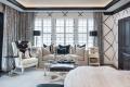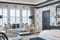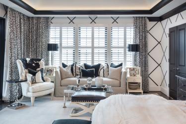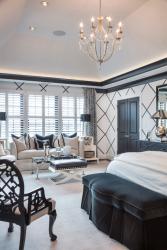 In the master bedroom—a room so large the sitting area holds a full-size sofa—the designers brought even more sophistication with special touches. A black velvet bench at the foot of the bed adds glamour; the headboard is black leather. The designers added black and white trim in a Chippendale-inspired design to the white sailcloth duvet. Gleaming chrome lamps by Jan Barboglio shimmer at night.