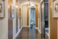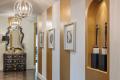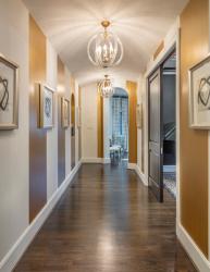 The same gold paint—a custom blend applied in a multi-step process—was used for wide stripes in a long hallway leading from a round entry to the open-concept kitchen and family room. Crystal ball chandeliers add another level of drama and sophistication.